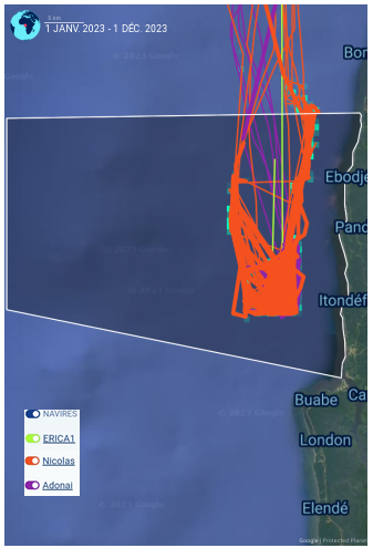 Carte 1 : Itinéraire des navires de pêche dans le parc National marin du 1er Janvier au 05 novembre 2023 (Données source Global Fishing Watch)