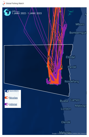 Suite à l’analyse effectuée avec l’application développée par Global Fishing Watch, il a été constaté que plusieurs zones du PNMMEC ont été régulièrement violées par trois chalutiers sous pavillon camerounais (Nicolas, Adonai et Erica) (voir cartes 1&2) depuis sa création. Les incursions de ces chalutiers se concentrent principalement dans la partie Sud-Est. Pourtant, cette zone située dans sa partie inférieure face à l’embouchure du fleuve Ntem, est riche en phytoplanctons en raison des décharges fluviales.