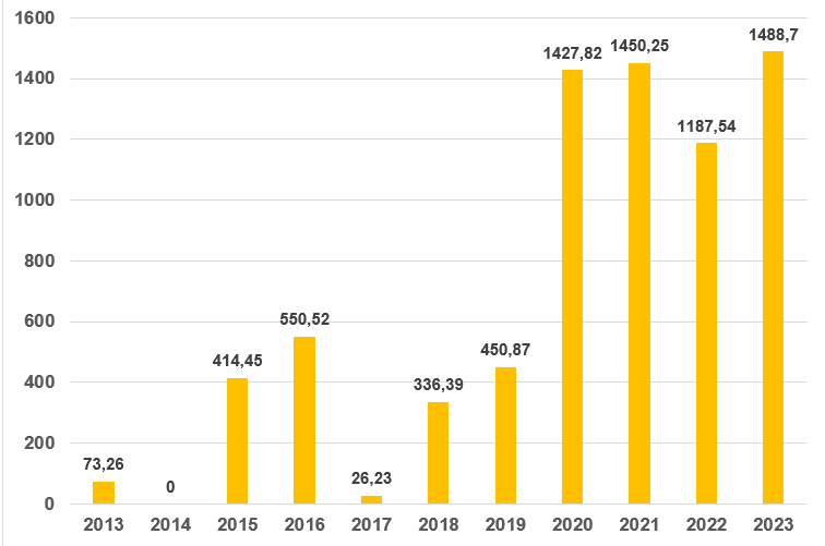 Par ailleurs, une analyse de la figure 4 qui présente l’effort de pêche dans cette Aire Marine Protégée (AMP) avant et après sa création entre 2013 et 2023) montre que l’année 2023 est celle où le PNMMEC aura subi la plus forte pression des chalutiers, ces onze dernières années avec un effort de pêche de 1488,7 heures (voir figure 3 ci-dessus).