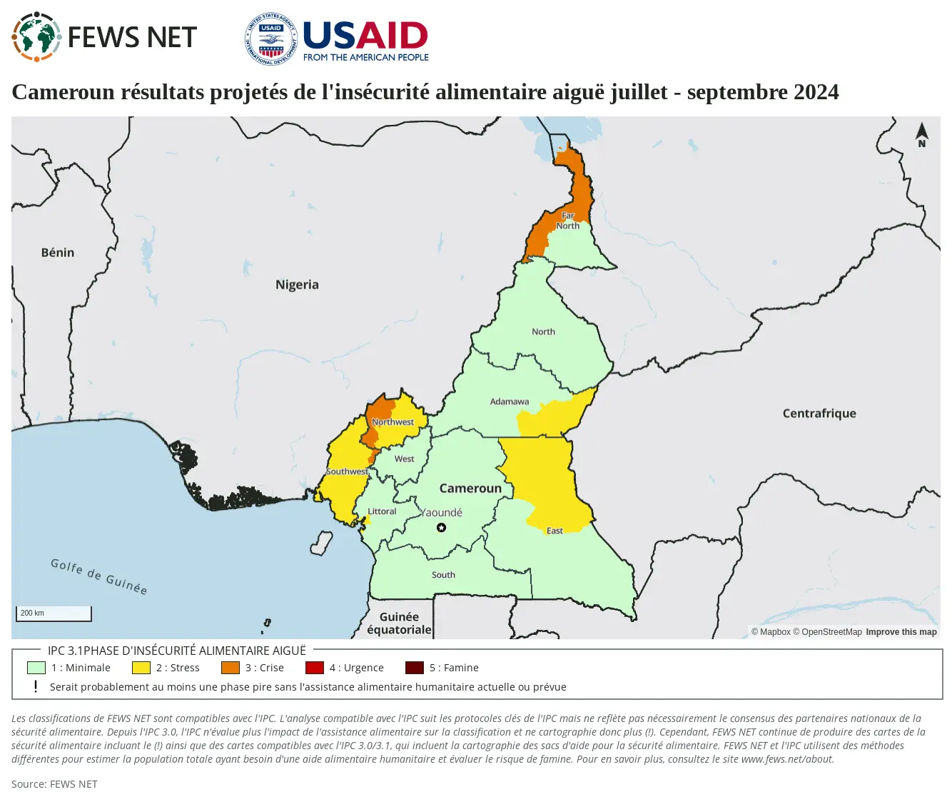 Cette crise alimentaire se confirme dans la publication de juillet 2024, du Famine Early Warning Systems Network (Fews Net), où il est clairement dit que dans les divisions éloignées et peu sûres comme le Lebialem, la Momo et la Menchum, la production agricole (de Juillet 2024, Ndlr) a été nettement inférieure à celle des années précédant le conflit, en raison d’une diminution importante des superficies cultivées. A cet effet, ce réseau des système d’alerte prédit qu’ : « à partir d’octobre 2024, l’épuisement précoce des stocks alimentaires dû à des années consécutives de production inférieure à la moyenne en raison des conflits entraînera des résultats de crise au niveau de la zone dans l’ensemble des régions du Nord-Ouest et du Sud-Ouest jusqu’en janvier 2025. »